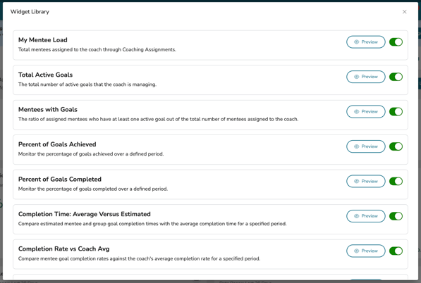 • Completion Rate vs Coach Average - Compare mentee goal completion rates against the coach's average complete rate for a specified period.