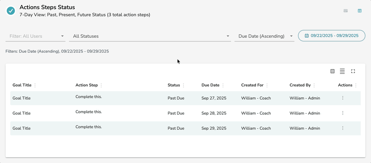 Near the top of this page, you will find a table for all Actions Steps Status. This table displays a 7-day view of all upcoming Action Steps in your created goals. Here you can filter the displayed action steps by Assigned User, Action Step Status, and Start/End Date Range.