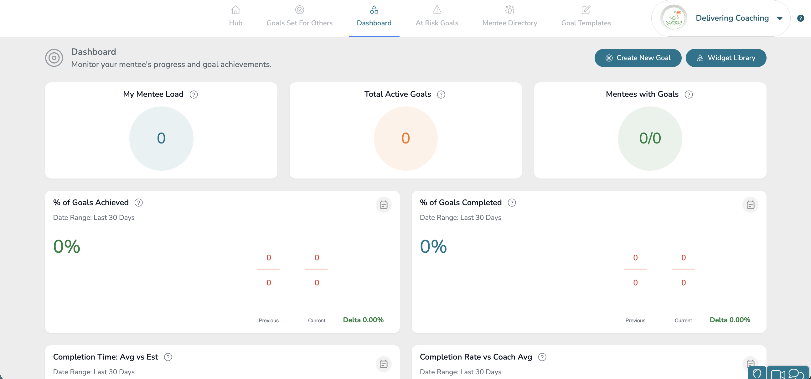 Your Dashboard from a Delivering Coaching view will display a variety of analytical charts and graphs via dashboard widgets. These dashboard widgets are intrinsically linked to the mentees assigned to you via the Coaching Assignments feature in your system.