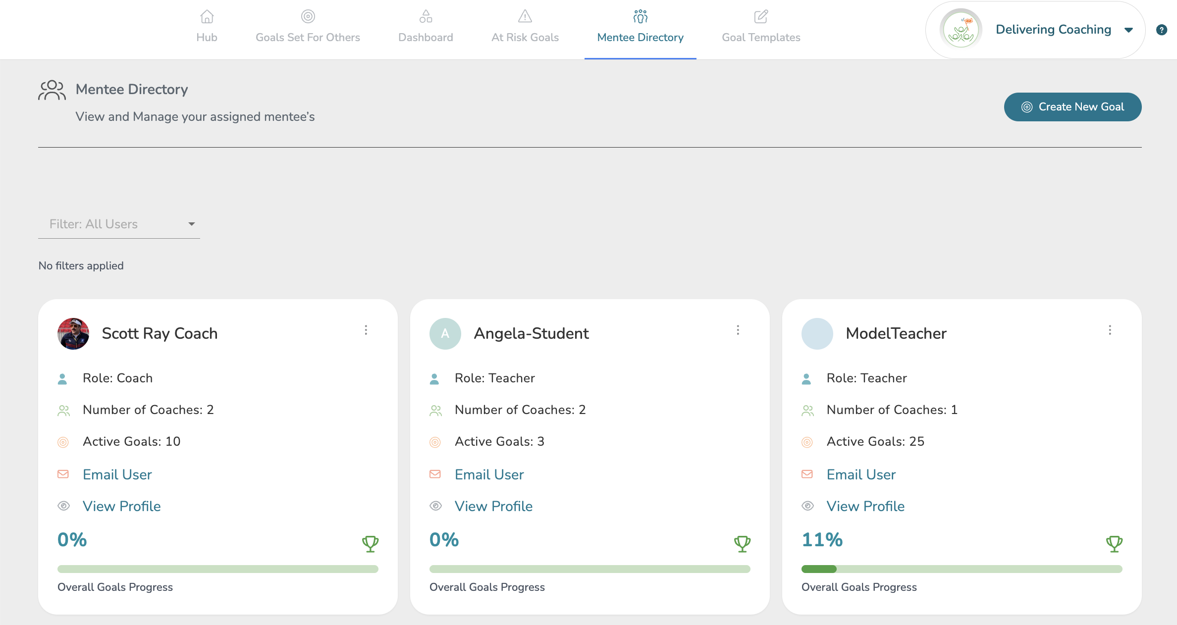 From a Delivering Coaching view, you can also access your Mentee Directory. This page displays all users assigned to you via your active Coaching Assignment(s).