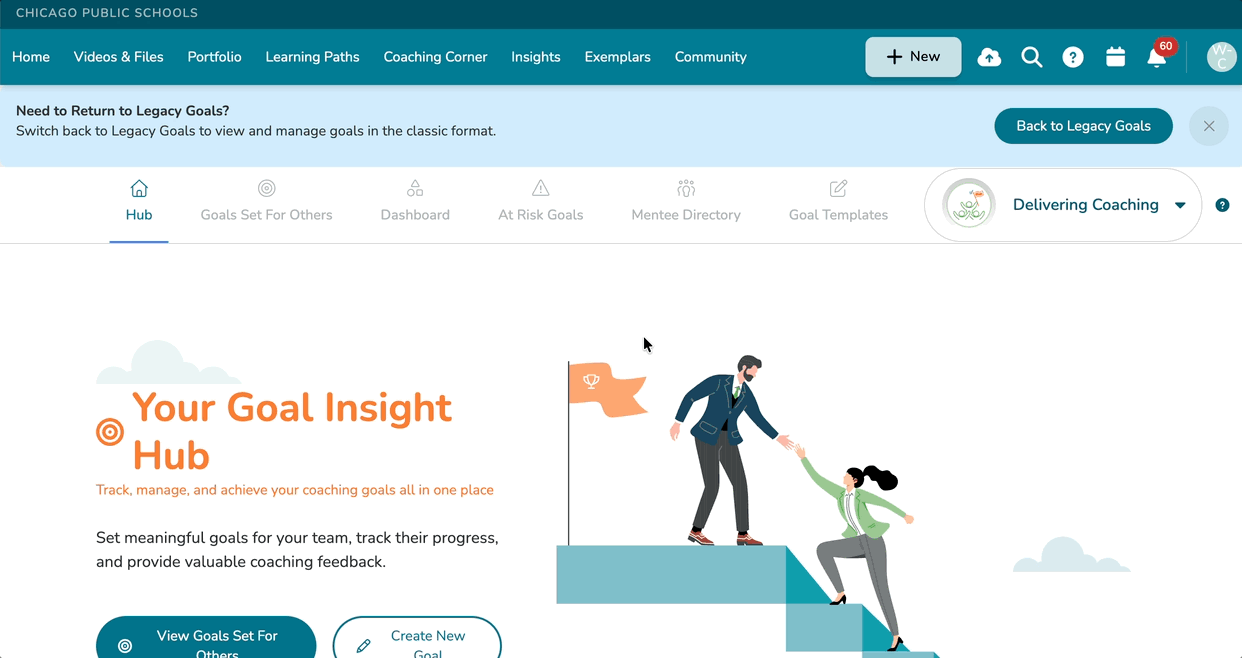 From the Delivering Coaching view, your Hub page will display a 'Your Goal Insight' view, wherein you can quickly route yourself to:
