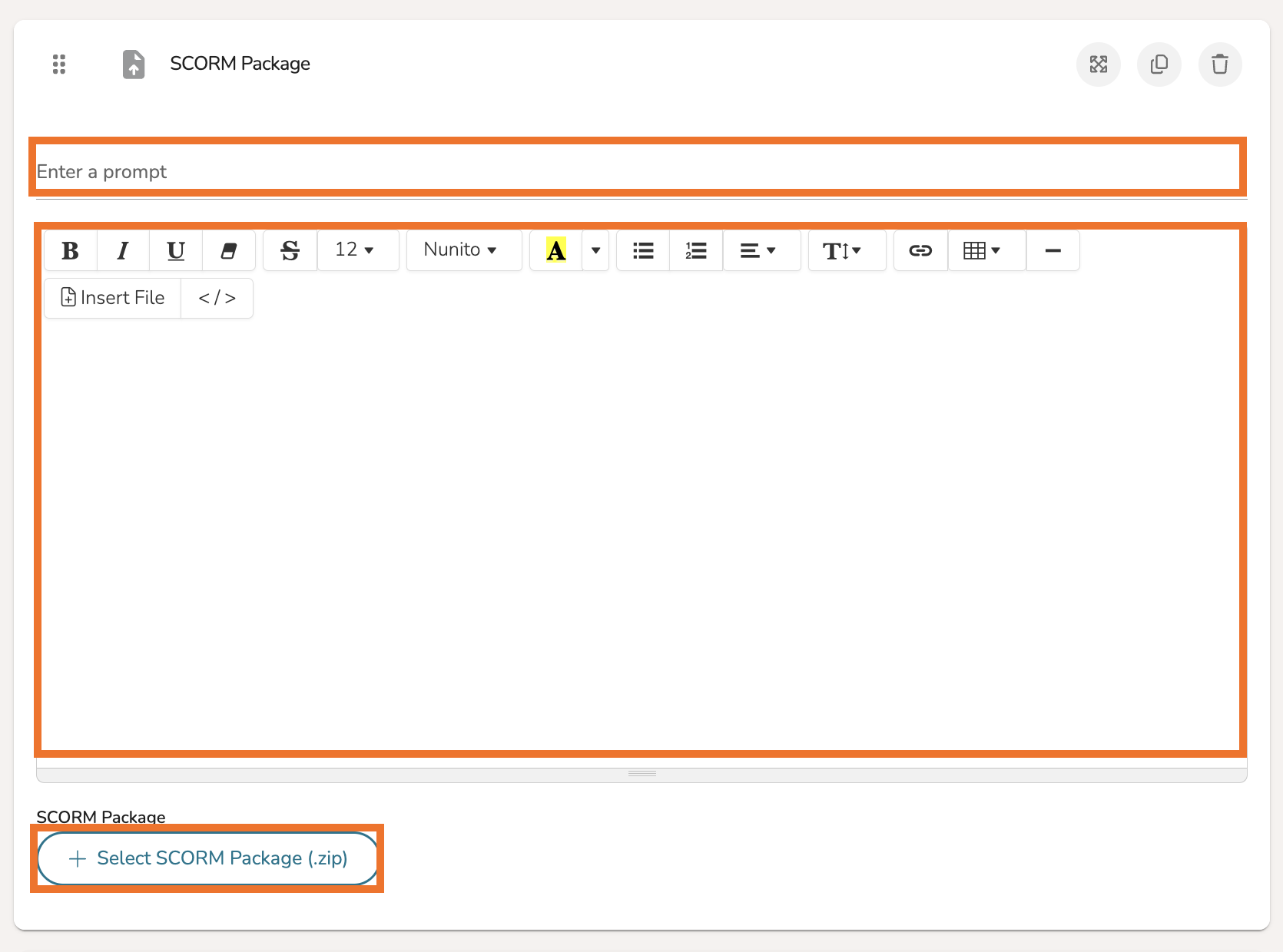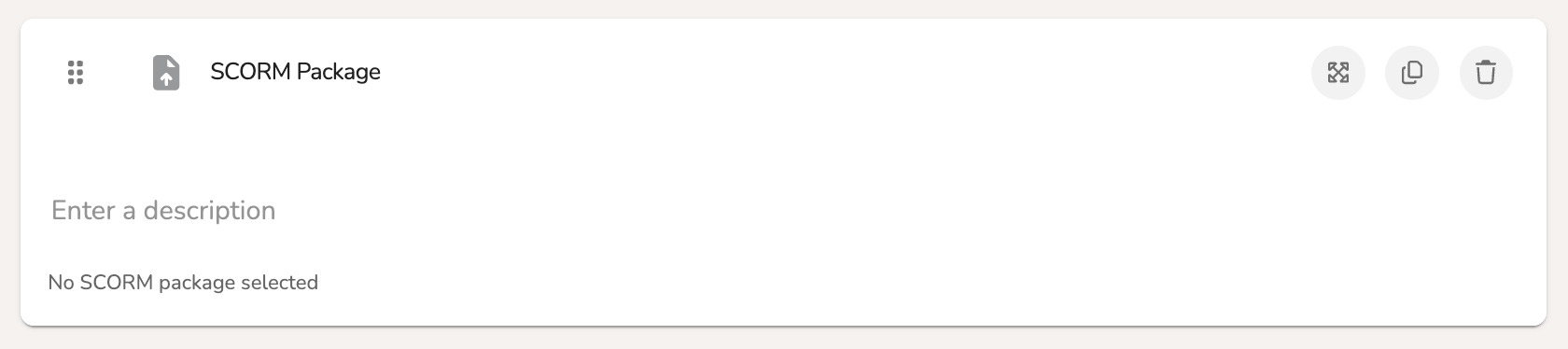 At the top of these settings, add a prompt to guide the participant, and provide a further description if needed. To add your SCORM Package ZIP file, click the 'Select SCORM Package (.zip)' button and add the SCORM Package of your course to this component.