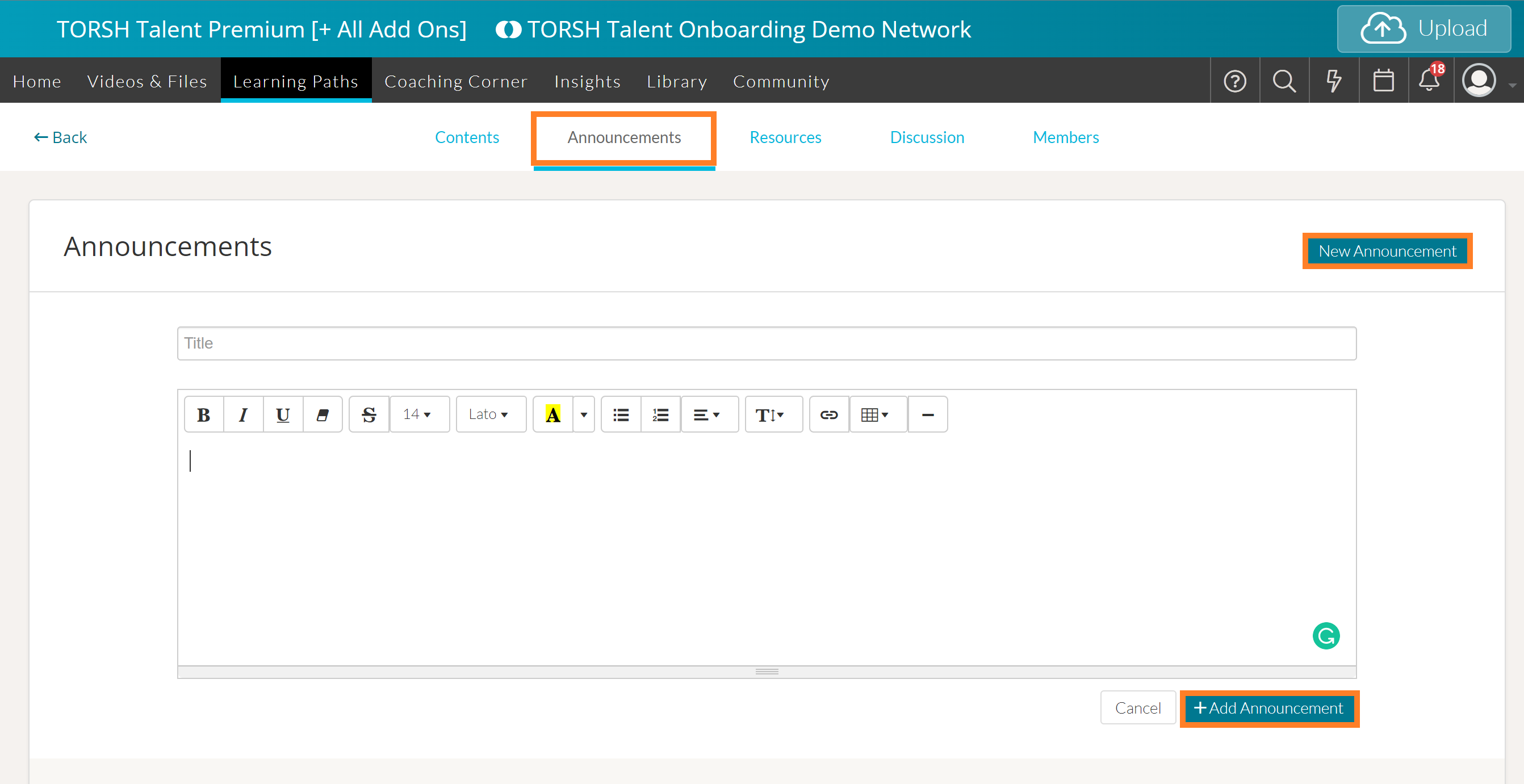 To add an announcement for module members, click the 'Announcements' tab from within the Learning Path module. Next, select ‘New Announcement.’ Give your announcement a title, add the content, then click the ‘+ Add Announcement' button, which will notify the members of the module.