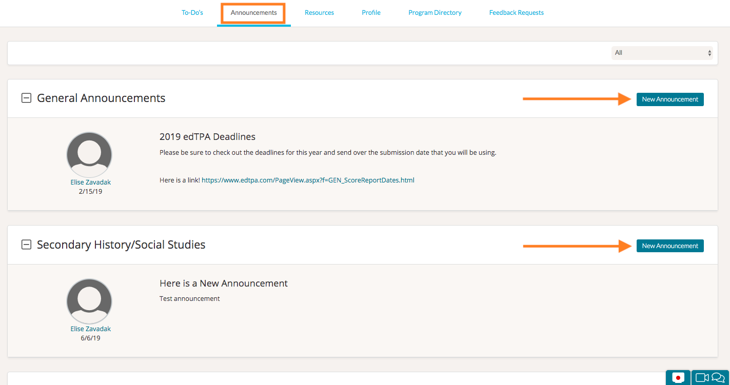 Once there, click on the 'Announcements' tab. You can choose to either make a 'General Announcement' or make an announcement for a specific edTPA program. Select 'New Announcement' to make your announcement.