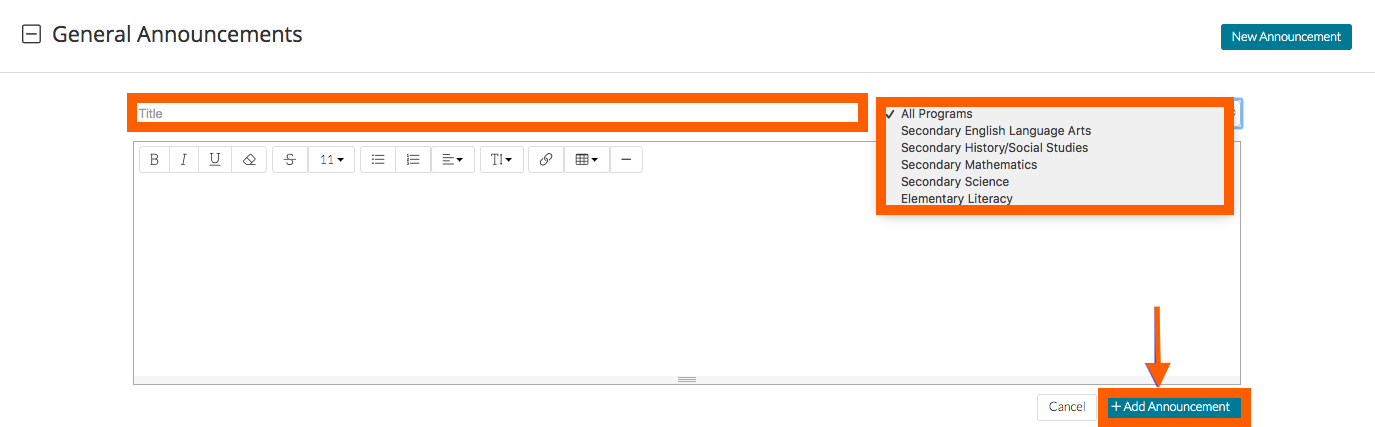 Next, give your announcement a title, choose which program you are creating the announcement for, then give your announcement context. Once you're done, click '+Add New Announcement.'