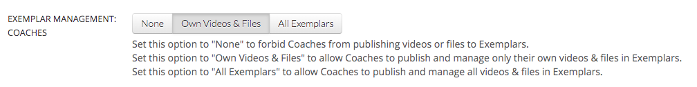 - If 'Own Videos & Files' is selected, Coaches will be able to publish and manage only the videos & files that they added to the Exemplar Library. This is the traditional setting.