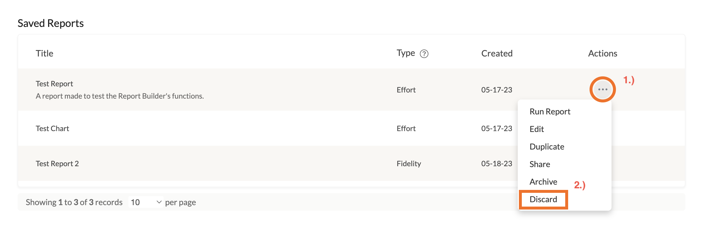 If you would like to delete your report, find the ‘Actions icon’ on the far, right-hand side of your report. A dropdown menu will appear. Click ‘Discard.’ A new window will appear, verifying that you are sure of your decision. Click ‘Discard.’ Doing so will discard the report to your Trash.