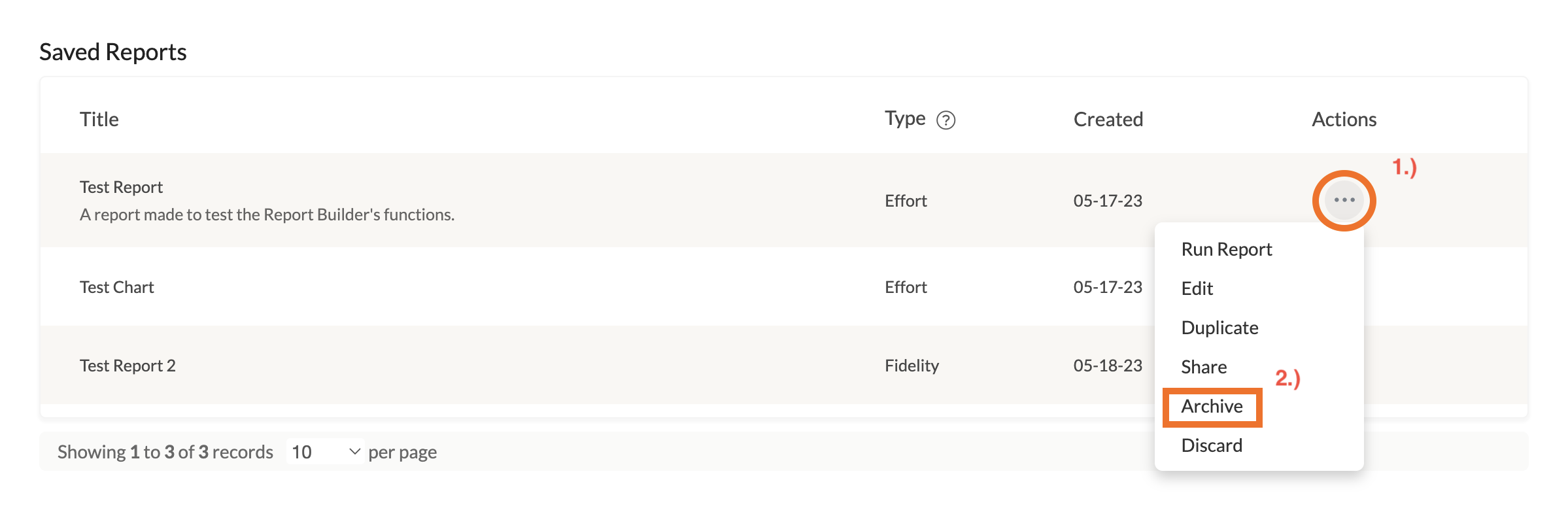 From the Report Builder Hub, find the report you would like to archive. Next, find the ‘Actions icon’ on the far, right-hand side of it. A dropdown menu will appear. Click ‘Archive.’