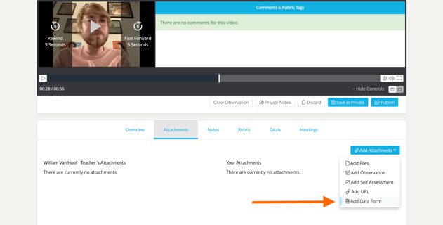 If you would like to attach a Data Form to an Observation, you can do so on the ‘Attachments’ tab of the Observation by selecting the ‘Add Attachment’ dropdown and selecting 'Add Data Form.'