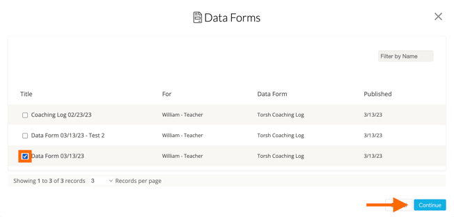 A new window will appear. Select the Data Form(s) you’d like to attach and click ‘Continue' to attach your data form to the observation.
