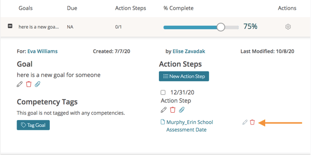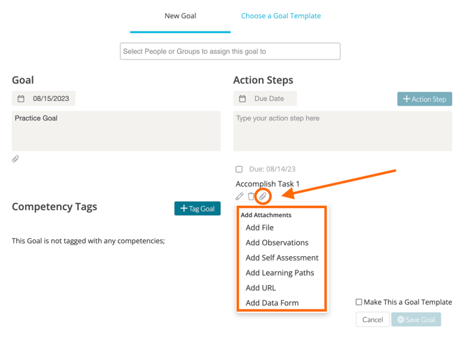 Users can attach files, observations, self-assessments, learning paths, URLs, and data forms to their Goals and Action Steps in order to indicate progress.