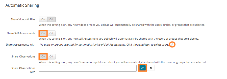 To enable automatic sharing, first click the 'On' toggle beside 'Share Observations' and/or 'Share Self Assessments.' Next, click the 'pencil icon' and select the users and/or groups with whom you would like to automatically share your published Observations and/or Self Assessments.
