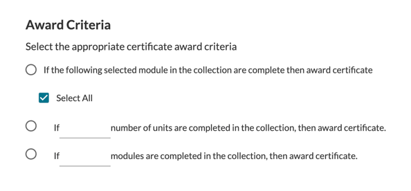 Scroll past the preview image of your course certificate to modify the Award Criteria. Here you can designate which specific modules within the course need to be completed in order to award the digital certificate. By default, this will be set to 'Select All.'
