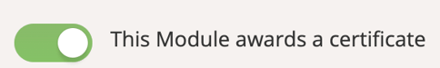 Once inside the module, click on its 'Settings' tab. Then scroll down to its Awards section. To enable the module to award a certificate, click the toggle for 'This Module awards a certificate' to display as GREEN/ON.