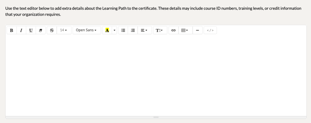 You can also use the text editor below your digital certificate selection to add extra details about the Learning Path to the certificate. These details may include course ID numbers, training levels, or credit information that your organization requires for the completion of the module.