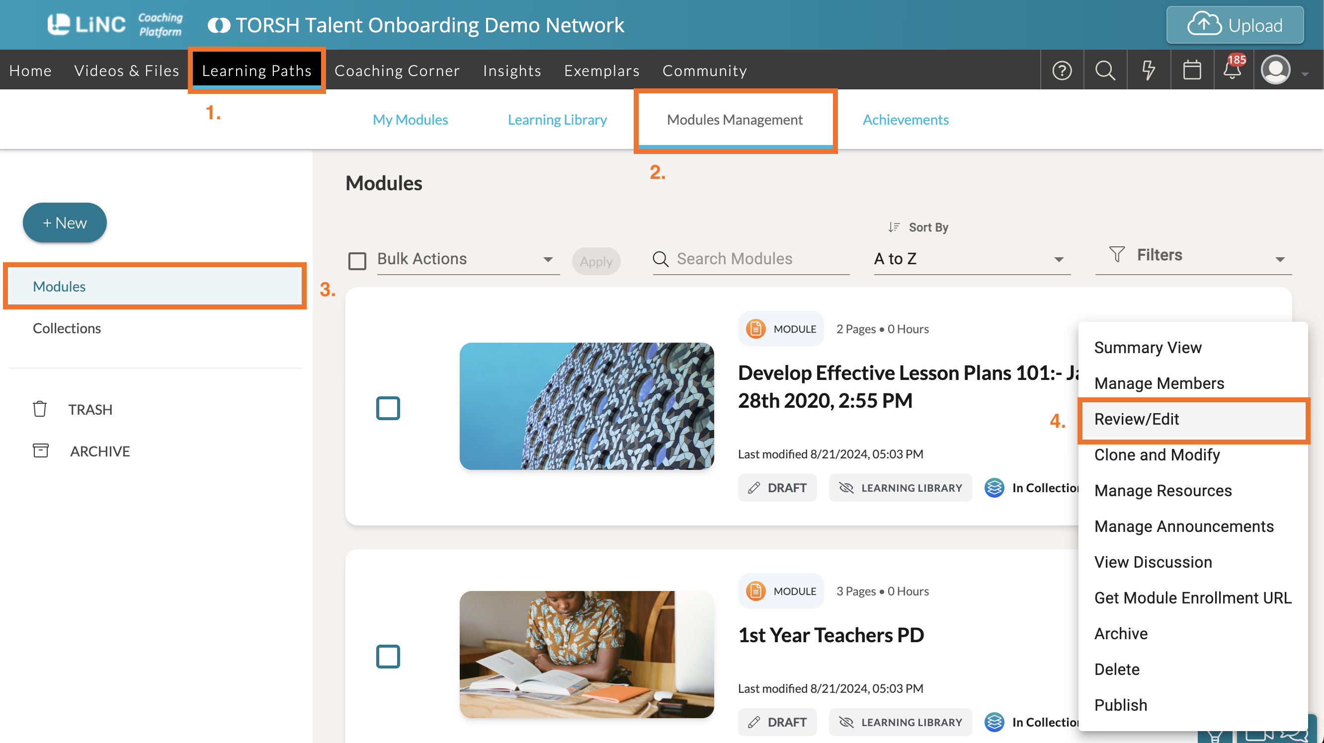 To enable a specific Learning Path module to award a digital certificate upon completion, first locate the module in your Modules Management tab. Once you have located the module, click on its '...' icon and select 'Review/Edit.' This will open the module's Edit view.