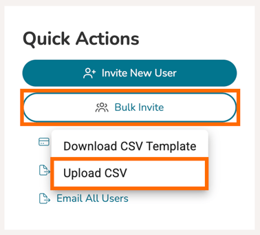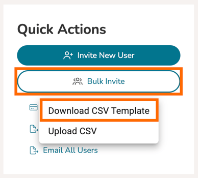 First, go to your Users Management panel. Once on the Users page, click 'Bulk Invite.' In the dropdown, select 'Download CSV Template.'
