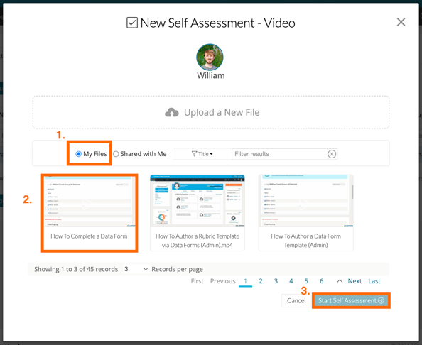 Next, click on the video or file you would like to observe, and then click 'Start Self Assessment.'