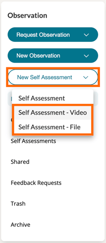 To start a new video/file self assessment from Coaching Corner, click on 'Coaching Corner' in your top navigation bar. Then select the 'Observations' tab. Next, click 'Self Assessments' on the far, left-side panel. On your Observations page, click the 'New Self Assessment' button and select either 'Self Assessment - Video' or 'Self Assessment - File' from the dropdown list.
