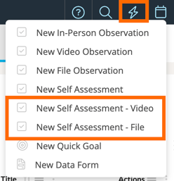 To start a video/file self assessment from the +New menu, hover over the +New button in the top, right-hand corner of your navigation bar. In the dropdown list, select either 'New Self Assessment - Video' or 'New Self Assessment - File.'