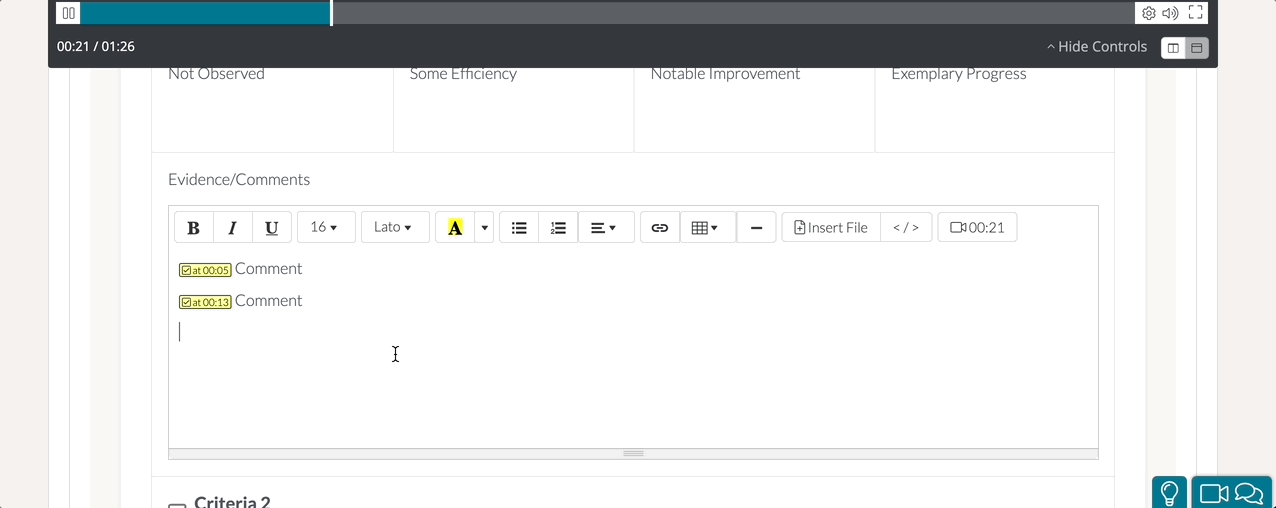 You can then fill out the rubric while watching your video and add any evidence/comments that are directly linked to the video. To leave a Timestamp within your Rubric Grid, simply click in the text box of your specified Criteria and then click the 'camera icon.' This will create a clickable timestamp link to the exact moment in the video observed when you clicked the camera icon. You can then add your comment beside this timestamp link to clarify further!