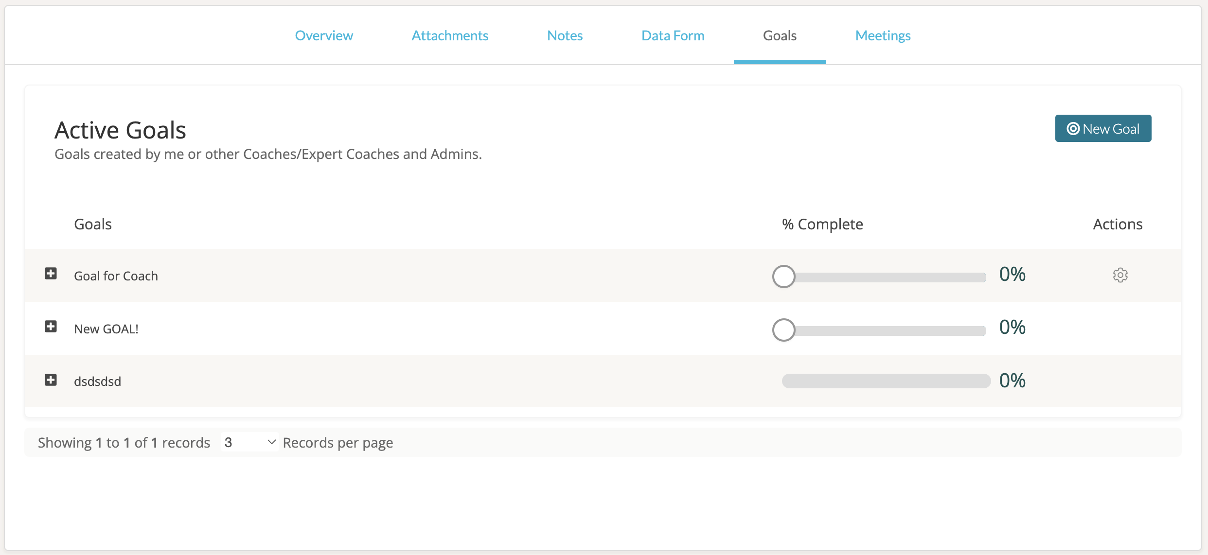 Goals - While performing a self assessment, you can manage the active goals for a yourself, including adding a new goal or managing the progress of another goal.