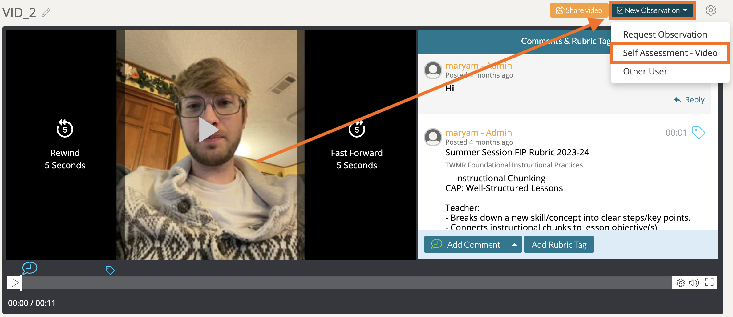 Lastly, you can start the video/file self assessment directly from the video or file you would like to observe. First navigate to the artifact from your Videos & Files page. Once you have opened the artifact, select ‘New Observation' in the top, right-hand corner and select either 'Self Assessment - Video' or 'Self Assessment - File' from the dropdown list, depending on the type of artifact you are observing.