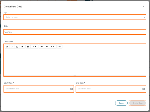 For this example, we'll choose 'Start from Scratch.' From here, you can assign for whom your goal is For in the top dropdown menu. You can also give your goal a Title and Description. Next, give your goal a Start Date and an End Date.