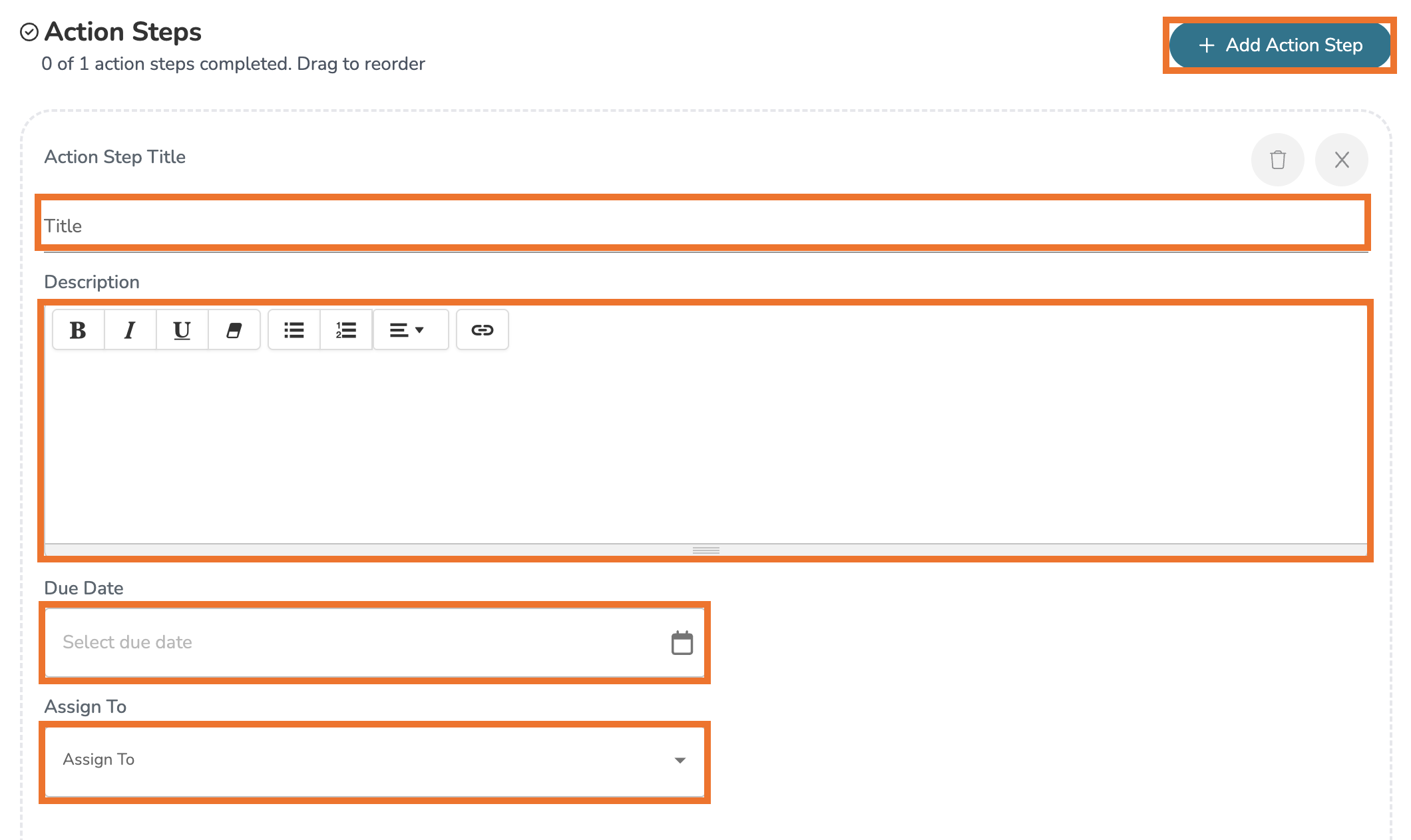 From here, click the 'Add Action Step' button in the top, right-hand corner. An action step window will appear. You can then give your action step a Title and a Description. Next, give your action step a Due Date. You can also Assign To specific users for whom the goal is shared with (In most cases, an action step is typically assigned to the user who whom the overall goal is assigned for).