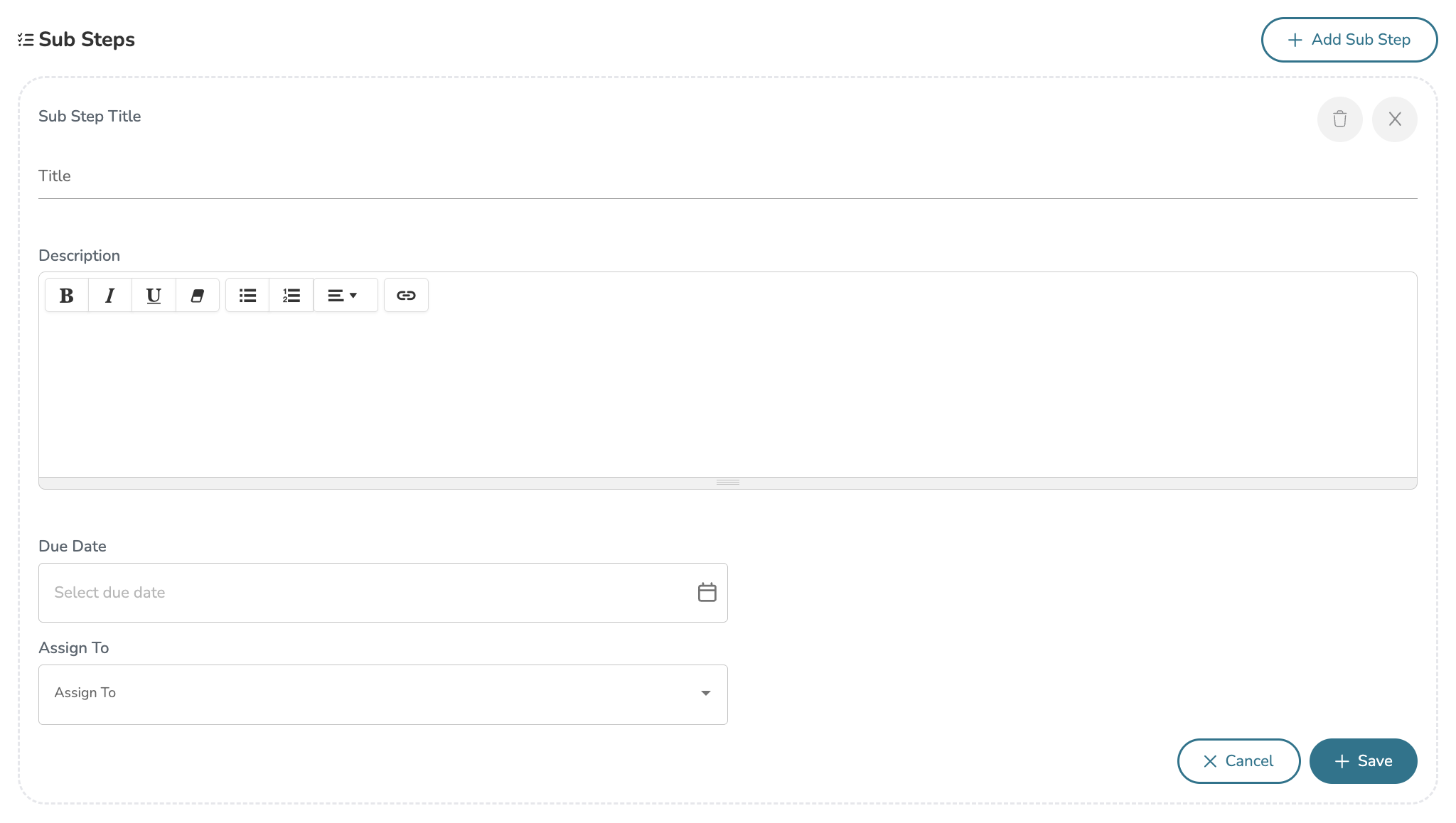 Much like a regular action step, you can give a Sub Step a Title and a Description. Next, give your sub-step a Due Date. You can also Assign To specific users for whom the goal is shared with. Click 'Save' to save the sub-step within the action step.