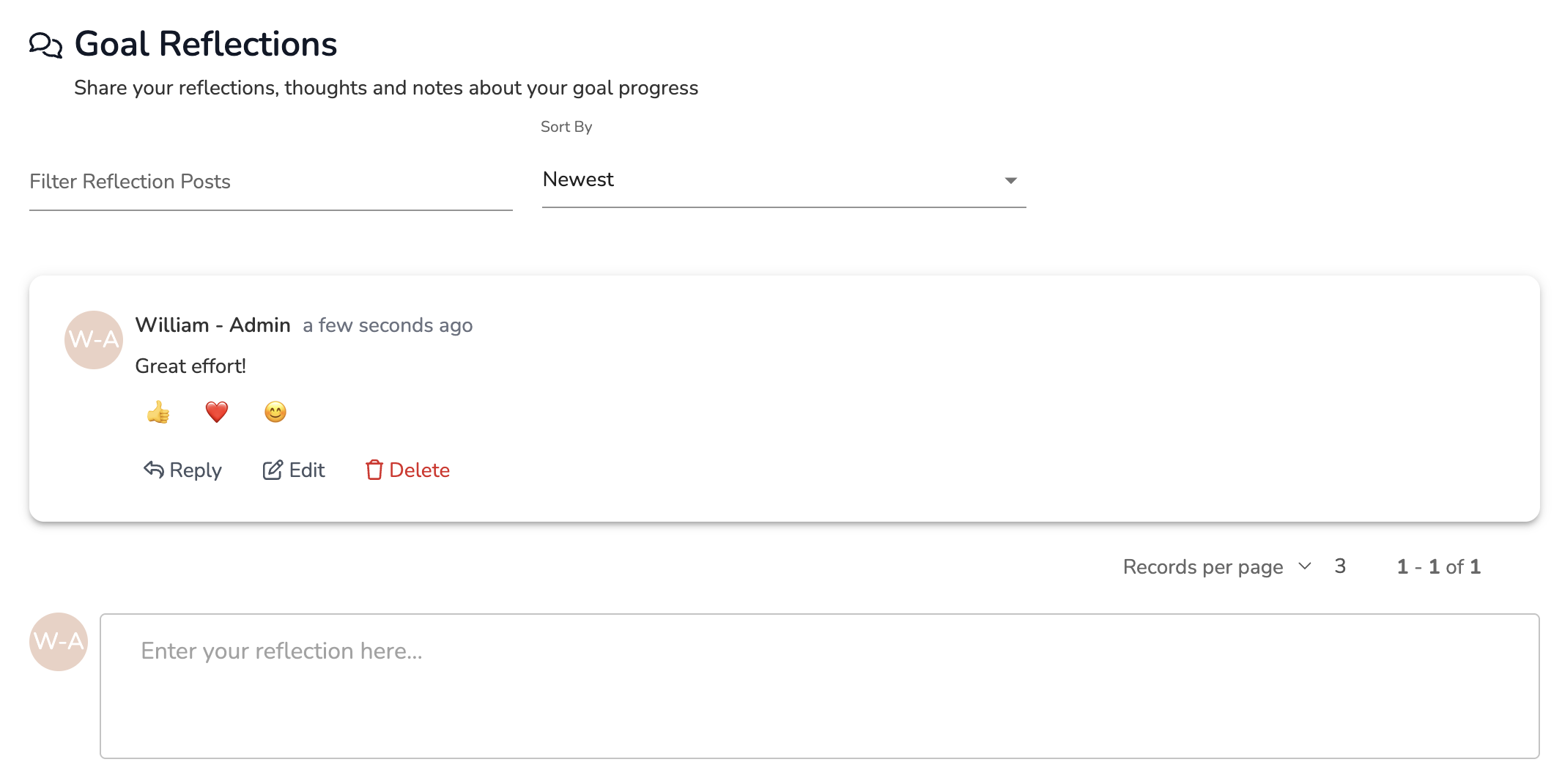 From here, your comment will appear in a comment thread. Others who can view this goal can reply as needed or post new comments in the Reflections tab.