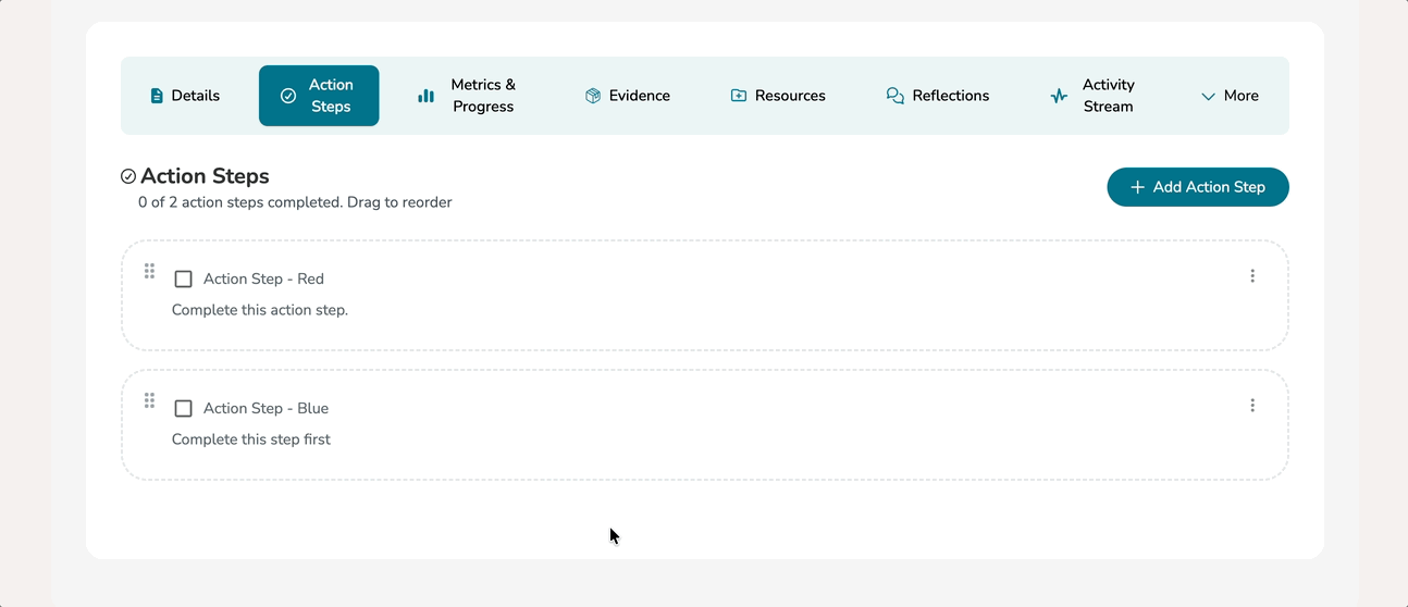 By default, your action steps will be arrange from most recently authored to least recently authored. Feel free to reorder their placement by drag-and-dropping them into whatever order you choose.
