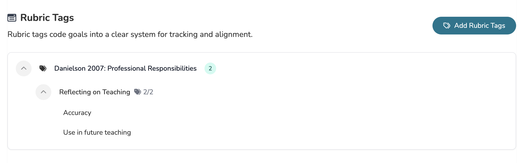 - Rubric Tags - Tags based on the specific domains and dimensions and criteria of active Rubric Templates in your system. These are great for tagging competency based on specific coaching practices.