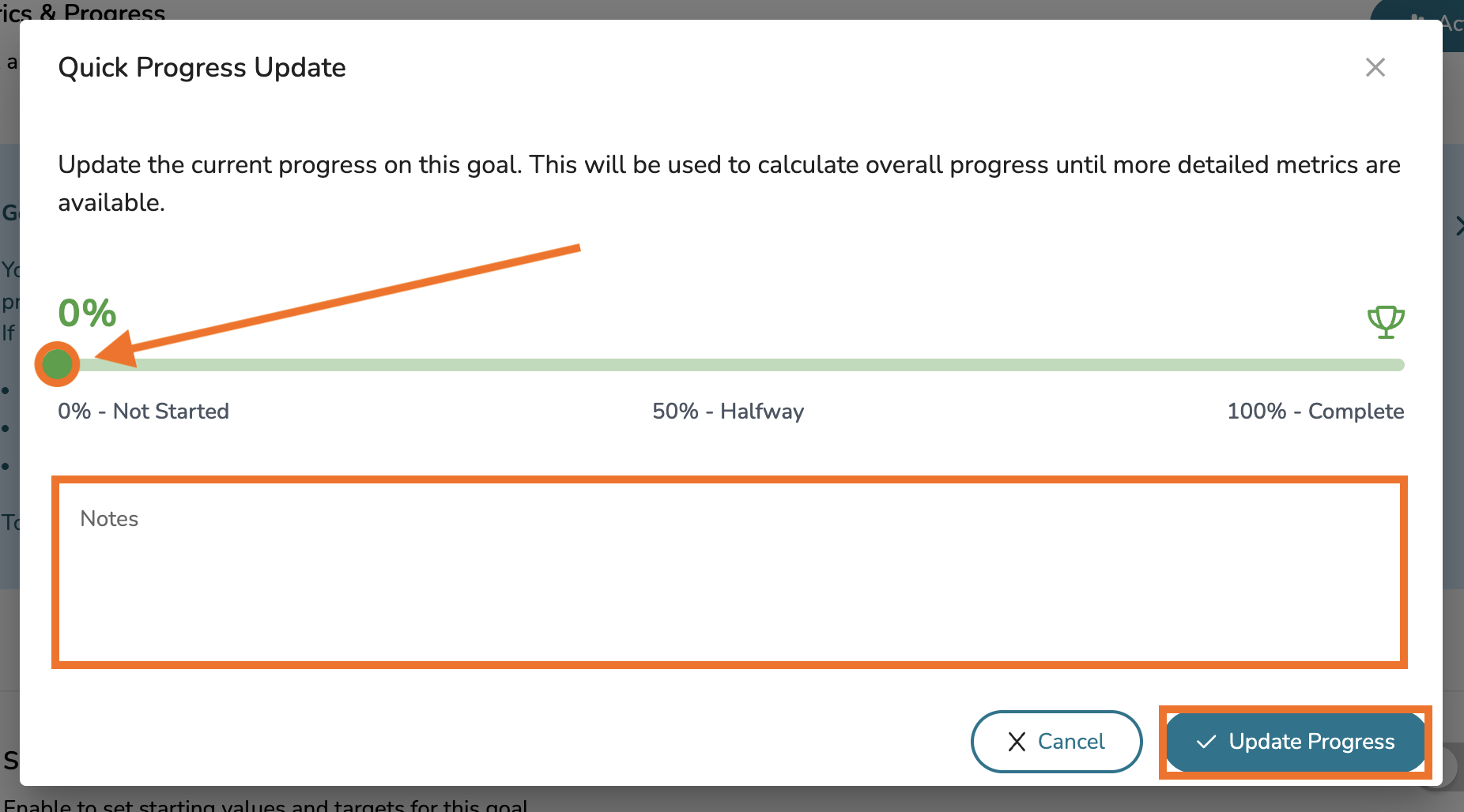 In the pop-up that appears, click and drag the progress marker to your desired percentage placement along the progress bar. You can even leave notes for the specific adjustment, providing reasoning for the change in progress. Lastly, click the 'Update Progress' button to save your changes.