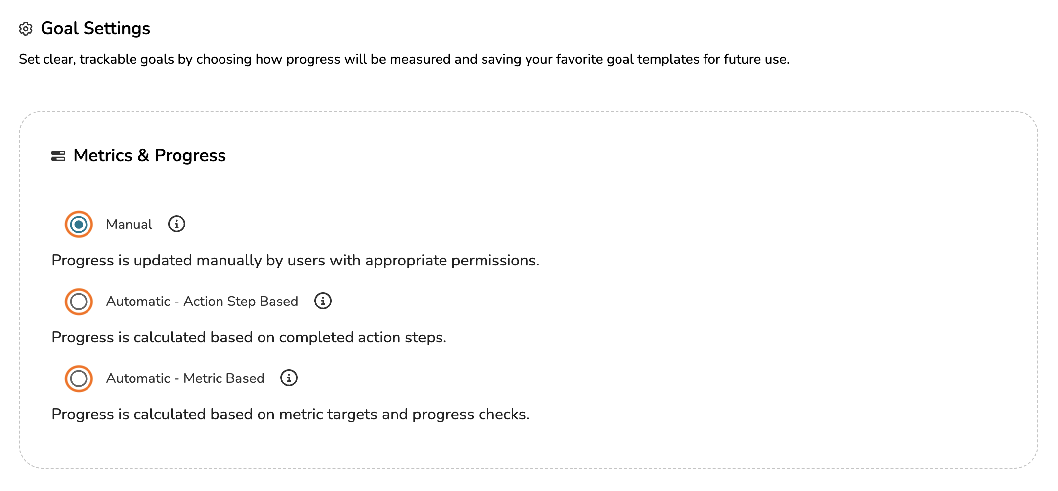 If your system has purchased the Goal Metrics add-on, then from the Settings page of a goal, you can choose to have progress calculated based on one of three different progress types (Otherwise, you will only have the option to manually modify goal progress):
