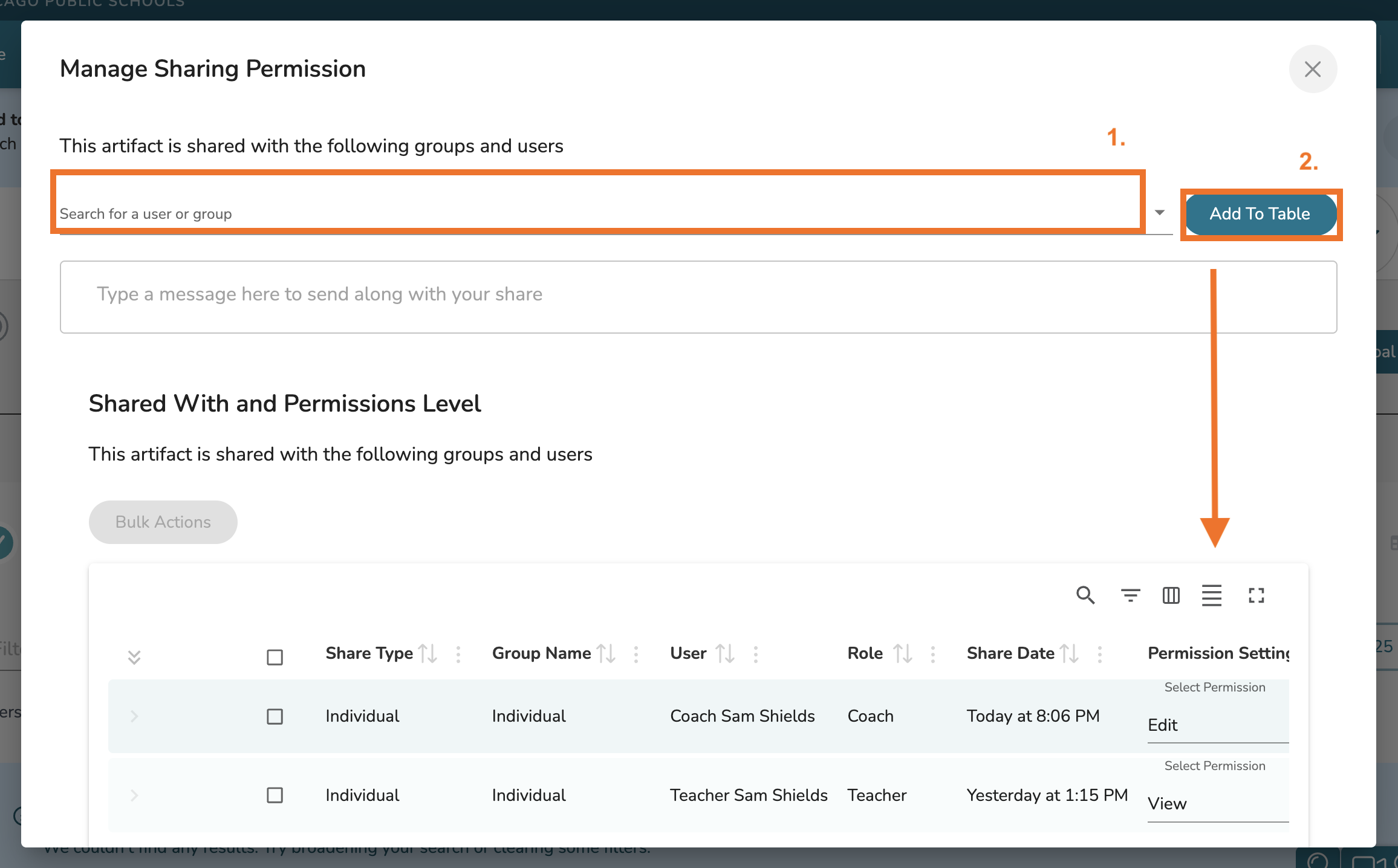 In the Share pop-up, select the individuals for whom you would like to share this goal with. Then click 'Add to Table.' Once they have been added to the table, you can modify their Permission Level in the table below.
