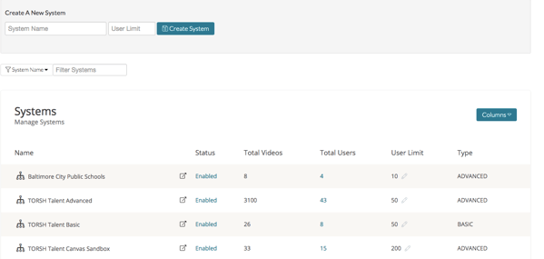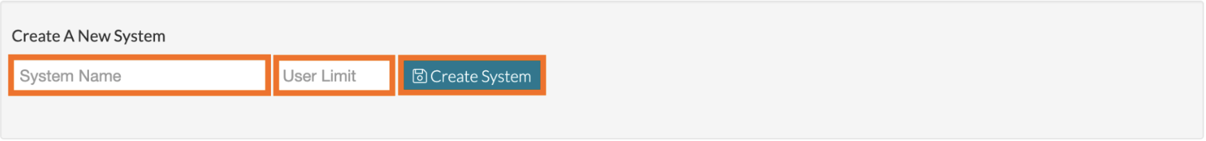 On the Systems Settings page, you will find all of your current enabled/disabled systems within your Network. To create a new system, first type in the name of the new system in the 'Create A New System' field and assign a User Limit for the system.