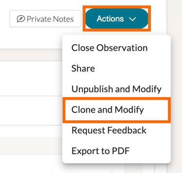 This will take you to your original observation. In the top, right-hand corner of your observation, click the 'Actions' button to display a list of options. From the dropdown, select 'Clone & Modify.'