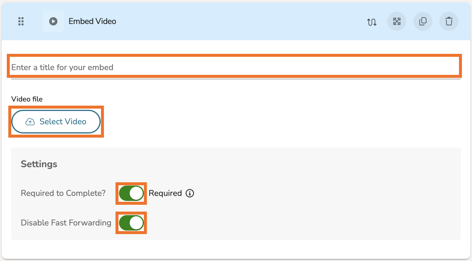 - If you would like for the embedded video to be required viewing in order to progress past this page, toggle the 'Required to Complete?' button ON.