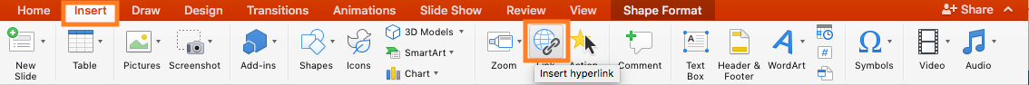 To insert your video via a hyperlink/URL, first copy the URL of the Talent video you would like to insert. Then, highlight the text or image you would like to use to hyperlink the video. Click 'Insert' on the top of your PowerPoint navigation menu, then select the 'Link' option. Here, you can insert the video's URL. Click 'Ok' when you are done.