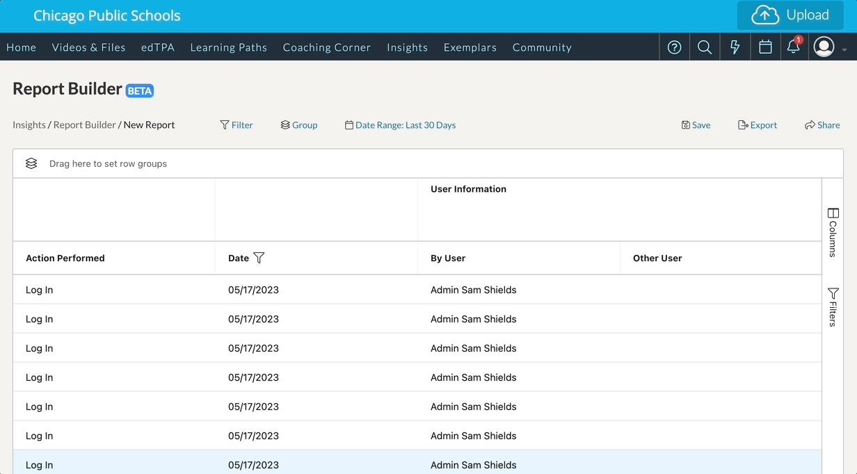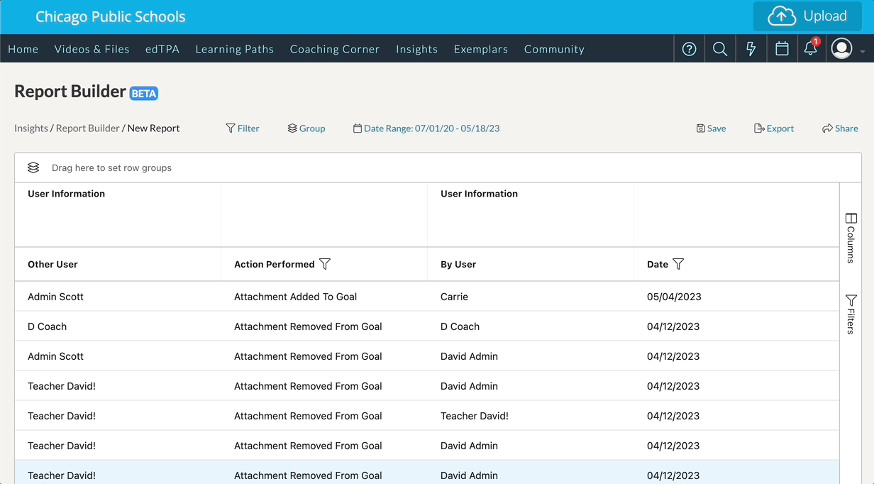 Using the Report Builder feature, you can choose to group your columns in order to display one data set that is associated with another. For instance, you may want to see all of the actions performed by a Coach for all of the Mentees they are coaching.