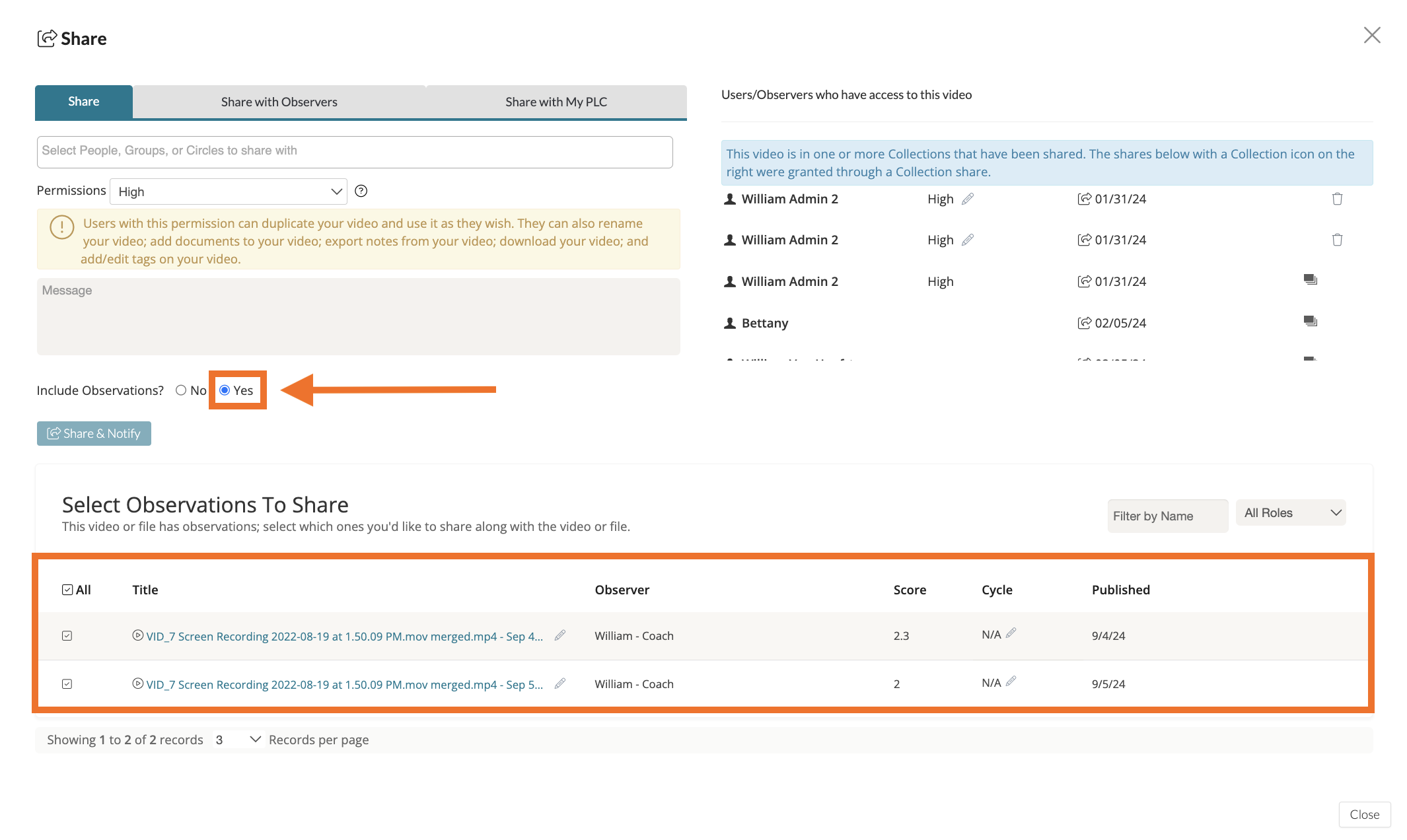 You will then see the 'Select Observations to Share' list. Choose the observations you would like to include and then select 'Share & Notify.'