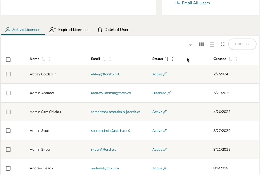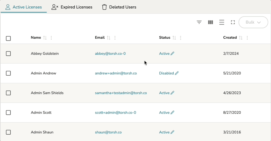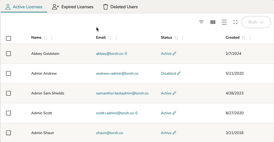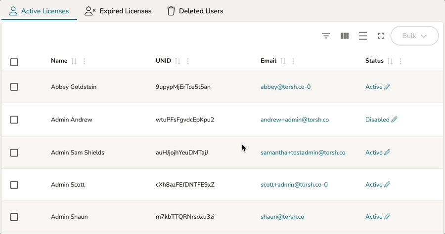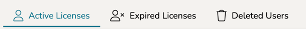 On your Users Management page, you will be presented with a full list of all Active Licenses, Expired Licenses, and Deleted Users in your system. Click on the respective tab at the top to view each table as needed.