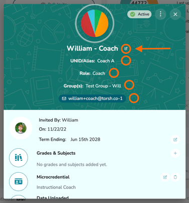 If you choose 'Edit' in the Actions Menu, the User Details pop-up will appear, wherein you can edit the following items by hovering beside each and clicking on their respective 'pencil icon':