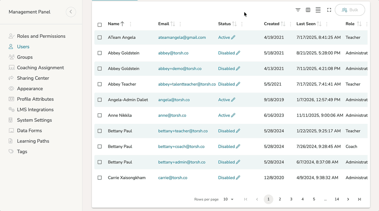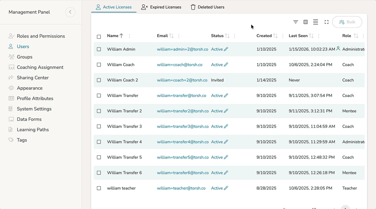 To perform Bulk Actions for multiple users at once, simply select the multiple users and then click on the 'Bulk' dropdown option in the top, right-hand corner of your displayed table to choose the action you would like to take.