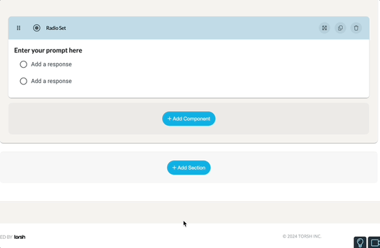 At the top of these settings, add a prompt to guide the participant. Make sure to add response text for each Response Field. If you would like for a response field to have a score/value, you can enter that beside the response text. You must have at least (2) Response Fields for this component.