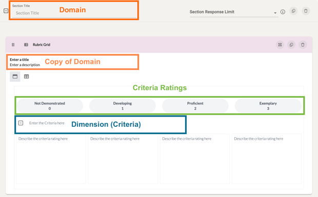 • Domain - The overall Section of your rubric grid, often designated by the Section Title your Rubric Grid component is housed in. For accurate data tracking, we highly recommend that you title your Rubric Grid component the same exact title as the Section it is housed in.
