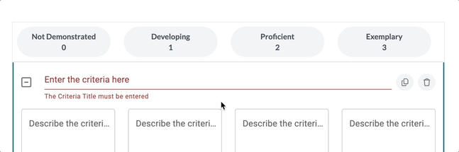 Click where it says 'Enter the Criteria here' to open your criteria's settings. Here you can give your criteria row a title. You can also select whether you would like to 'Duplicate' the entire criteria and all of its criteria ratings or 'Delete' the criteria and its associated criteria ratings.