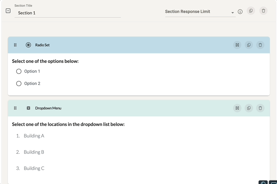 In order to adjust the display and look of a component, simply click in its general preview answer area, and the component will expand to show settings that allow you to manage the title, description and answer choices the users of your system will see! You can also easily view all edit option of a component by clicking the 'expand icon' found in the upper, right-hand corner of each component.