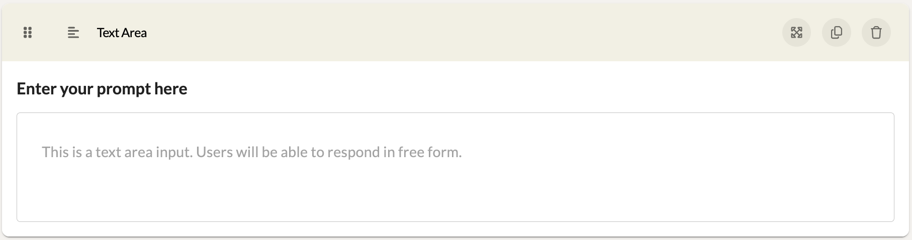 A Text Area component offers a larger space to type a large amount of text for a response. This component can be useful when asking participants to respond in full sentences and paragraphs.